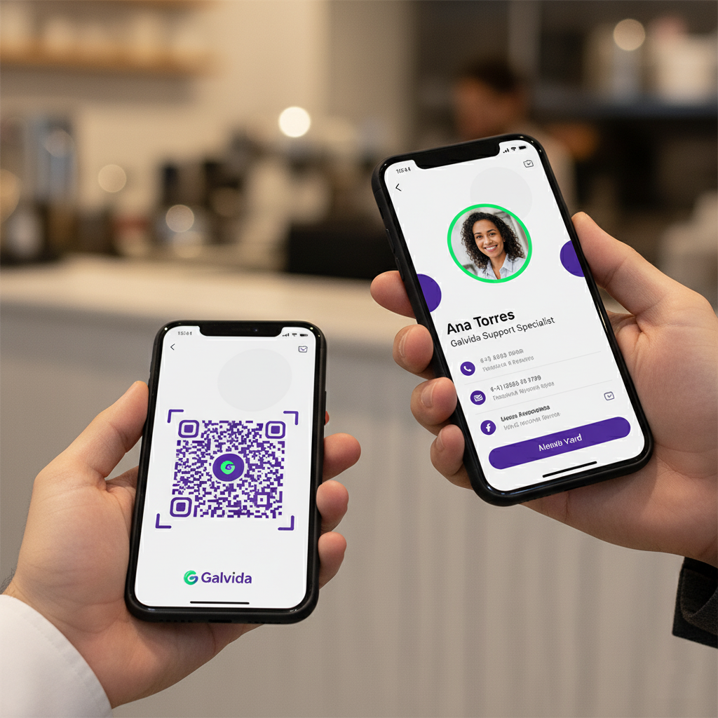 Comparte al Instante Entrega tu información de contacto mediante un código QR, enlace directo o en tu firma de correo. Cero fricción, máximo impacto.